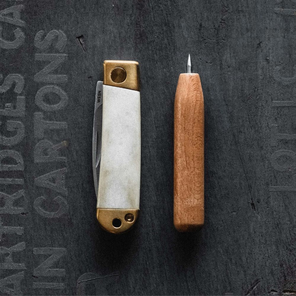 All of these scrimshaw knives come with a bespoke engraving kit that includes a wooden carving tool, ink, and instructions so you can create a knife that’s uniquely yours.