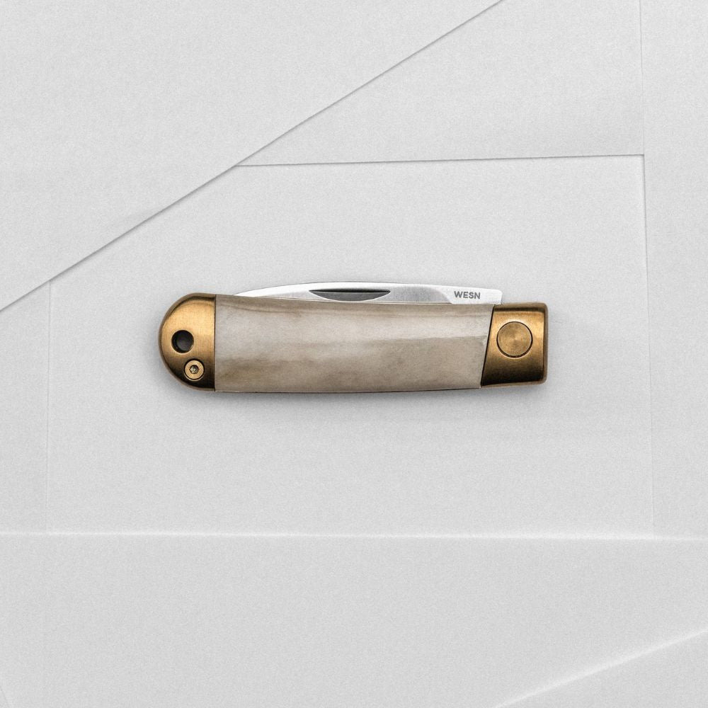 The Scrimshaw Henry collection is our modern take on classic scrimshaw style knives - made in collaboration with Birmingham-based P&Co. This version of our classic slipjoint knife, the Henry, includes brass hardware and an ethically sourced ox bone handle, perfect for custom engraving.