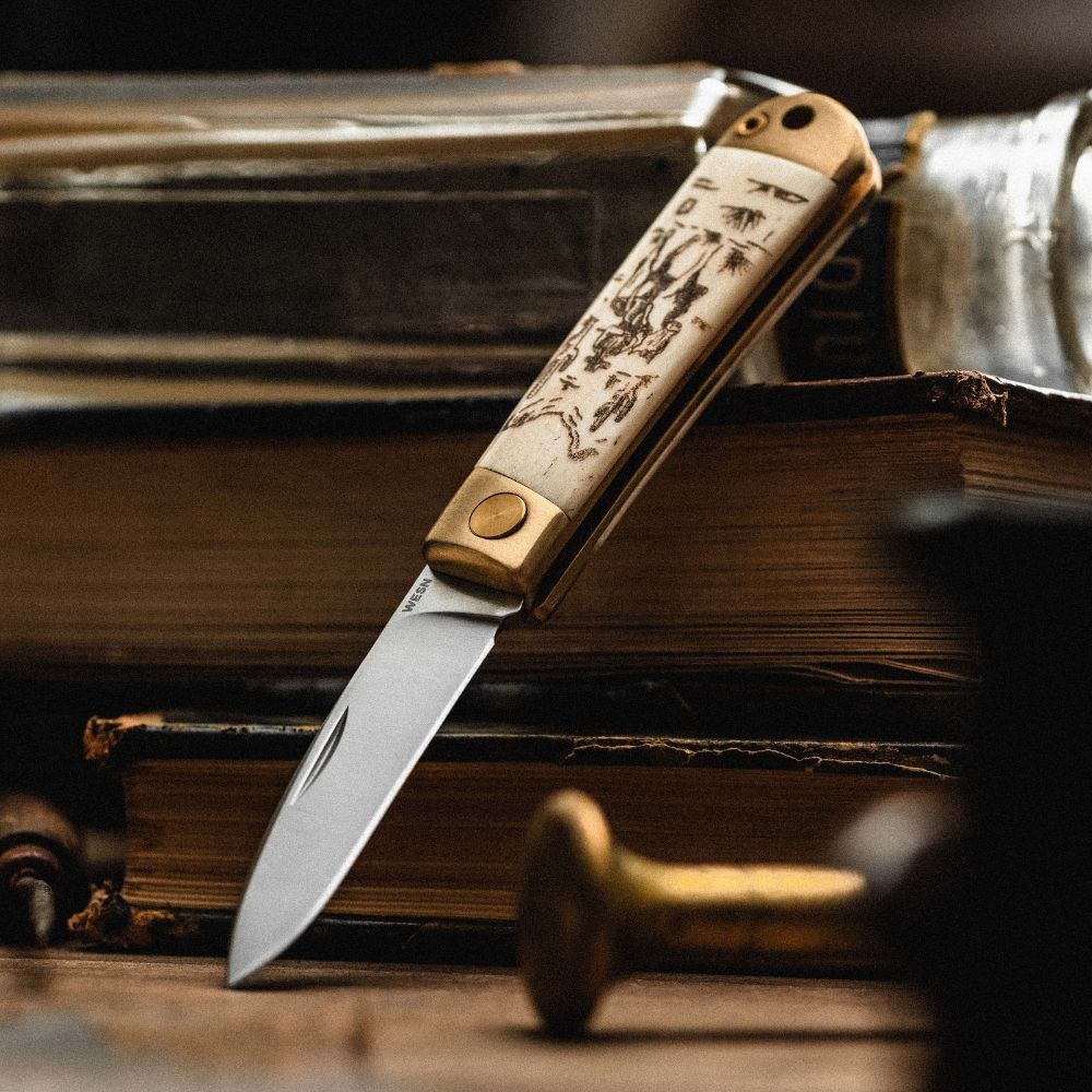 The Scrimshaw Henry collection is our modern take on classic scrimshaw style knives - made in collaboration with Birmingham-based P&Co. This version of our classic slipjoint knife, the Henry, includes brass hardware and an ethically sourced ox bone handle, perfect for custom engraving.