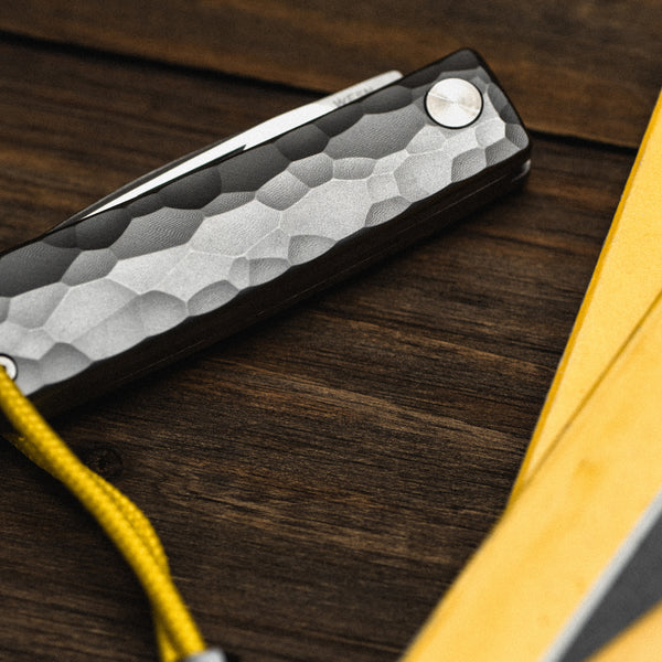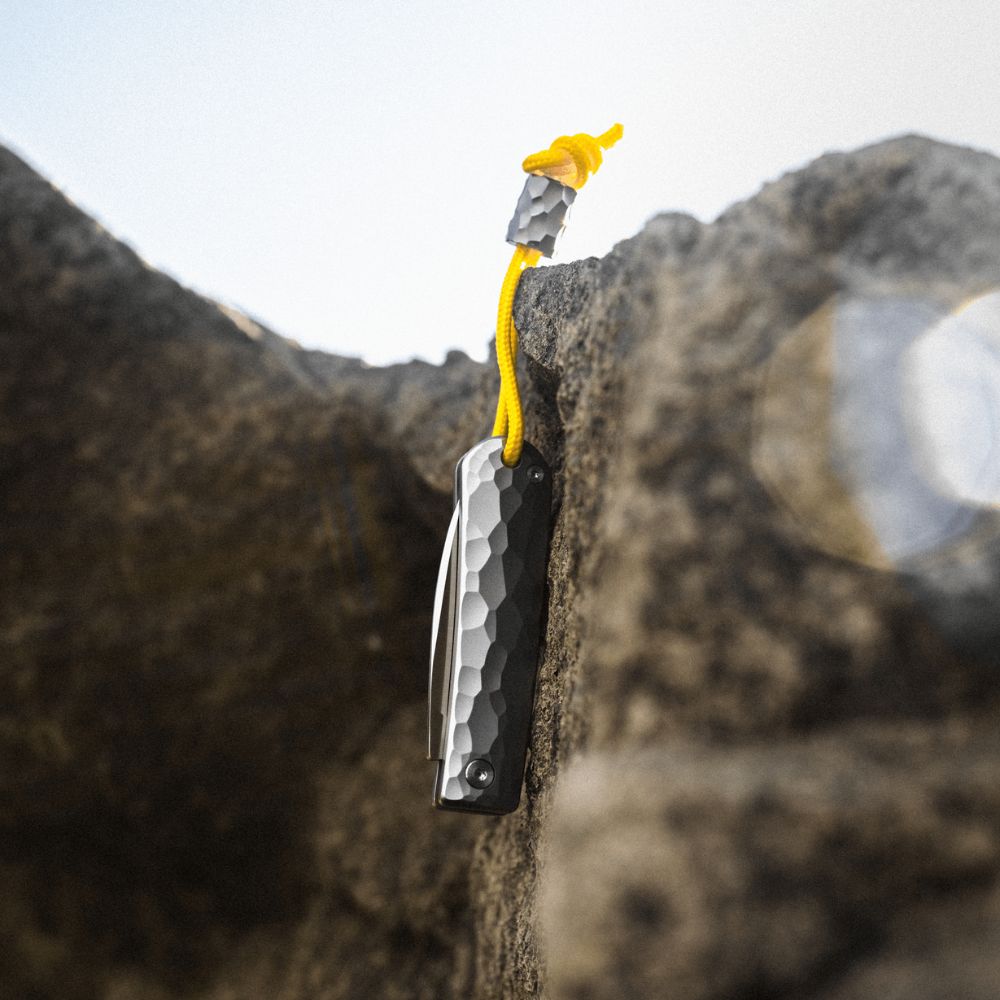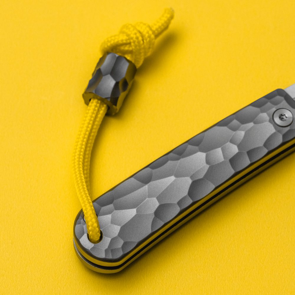 Each Ridgeline Henry also includes a meticulously designed and mountain-inspired Grade 5 Titanium lanyard bead, & yellow lanyard string.
