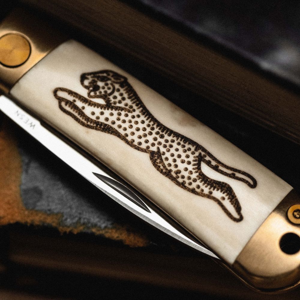 The Scrimshaw Henry collection is our modern take on classic scrimshaw style knives - made in collaboration with Birmingham-based P&Co. This version of our classic slipjoint knife, the Henry, includes brass hardware and an ethically sourced ox bone handle, perfect for custom engraving.