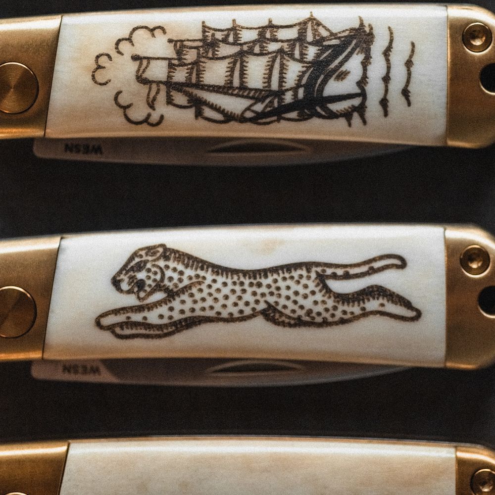 Scrimshaw is a classic maritime artform that dates back to the 18th and 19th centuries, created primarily by sailors on long sea voyages. With limited materials, they carved intricate designs into whale bone, ivory, and other natural resources they had on hand, filling those carvings with ink or soot. The result was a knife that wasn't just a tool - it was a personal artifact, carrying the maker’s story. Our Scrimshaw Henry collection is a modern interpretation of this tradition.