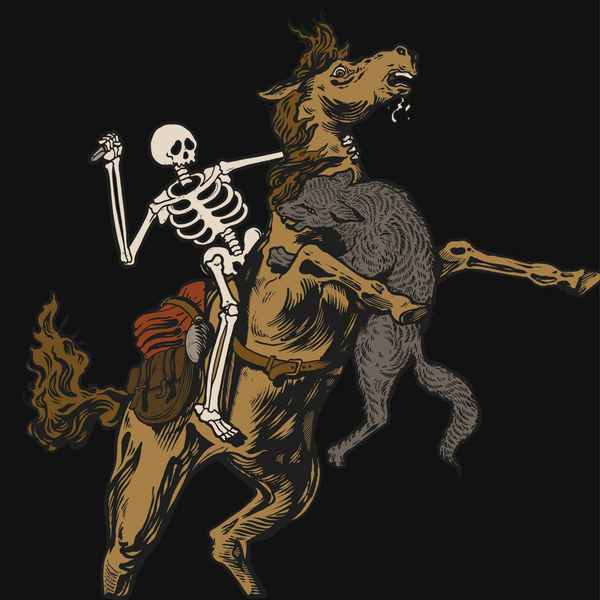 The front features a wolf emblem framed by the motto “Sticks and stones and steel and bone.” The back holds a full canvas illustration of a horse mid-battle with a wolf and the text “Power through it” - complete with Mr. Skelly wielding the WESN Microblade.