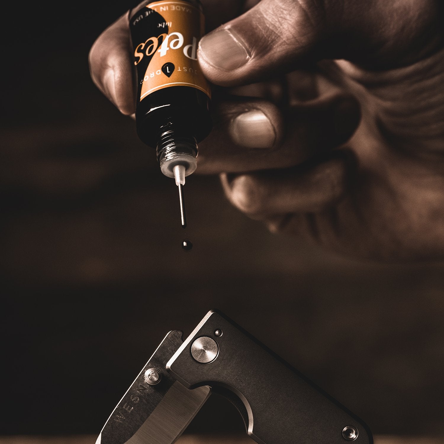 Pete’s Lube is a fully synthetic oil designed to keep your blade opening smoothly and operating as it should. One small drop is all it takes to reduce friction, protect moving parts, and maintain consistent performance over time.